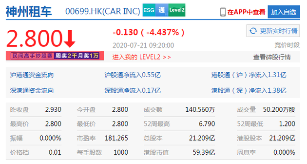 7月21日上午音讯,神州租车于明天上午9时正式规复交易,收盘跌超4%报2.80港元。