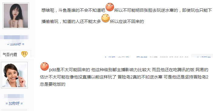 不外,PDD回归顺水寒最年夜的障碍却有一个:PDD签约正在斗鱼旗下的好汉同盟专区,等于直播约就签给了腾讯,但是顺水寒是网易的游戏。PDD能够玩斗田主、玩冒险岛,然而腾讯会容许他回归网易的游戏吗?况且仍是自家的竞品游戏《顺水寒》。早前,PDD都是早晨偷摸着播一会顺水寒,如今想要光明磊落的回归顺水寒,太难。