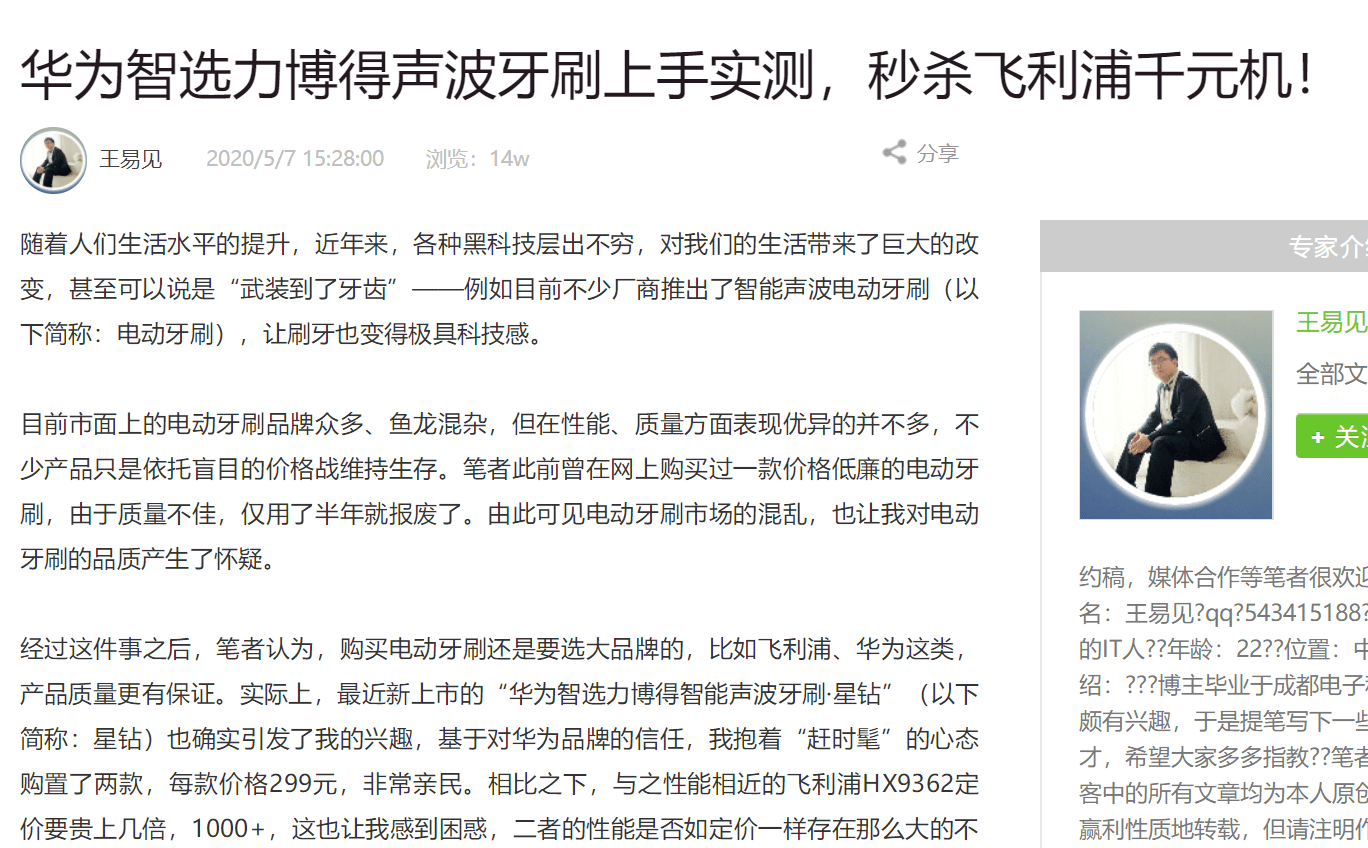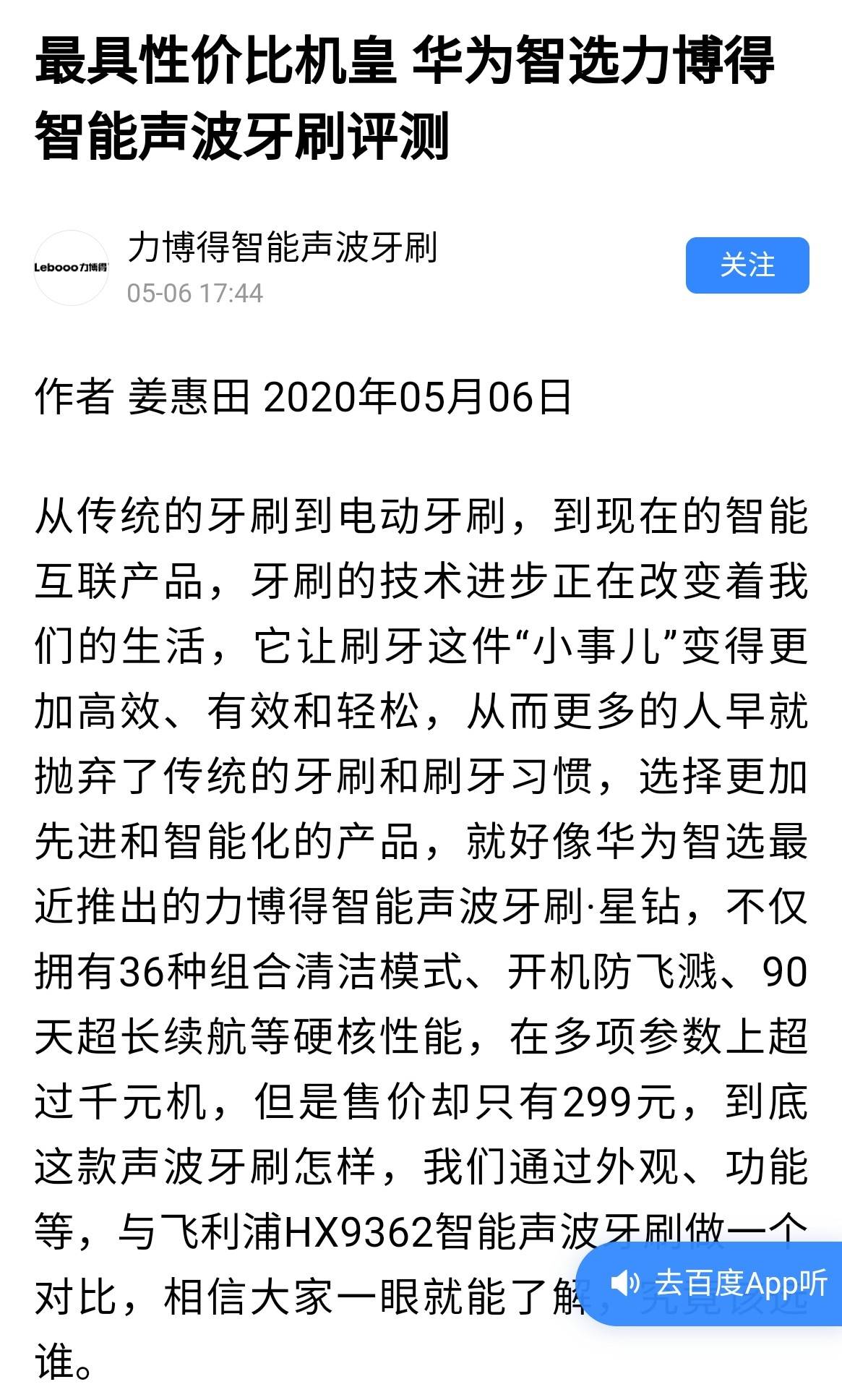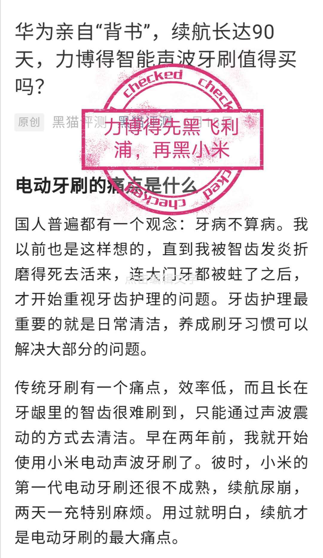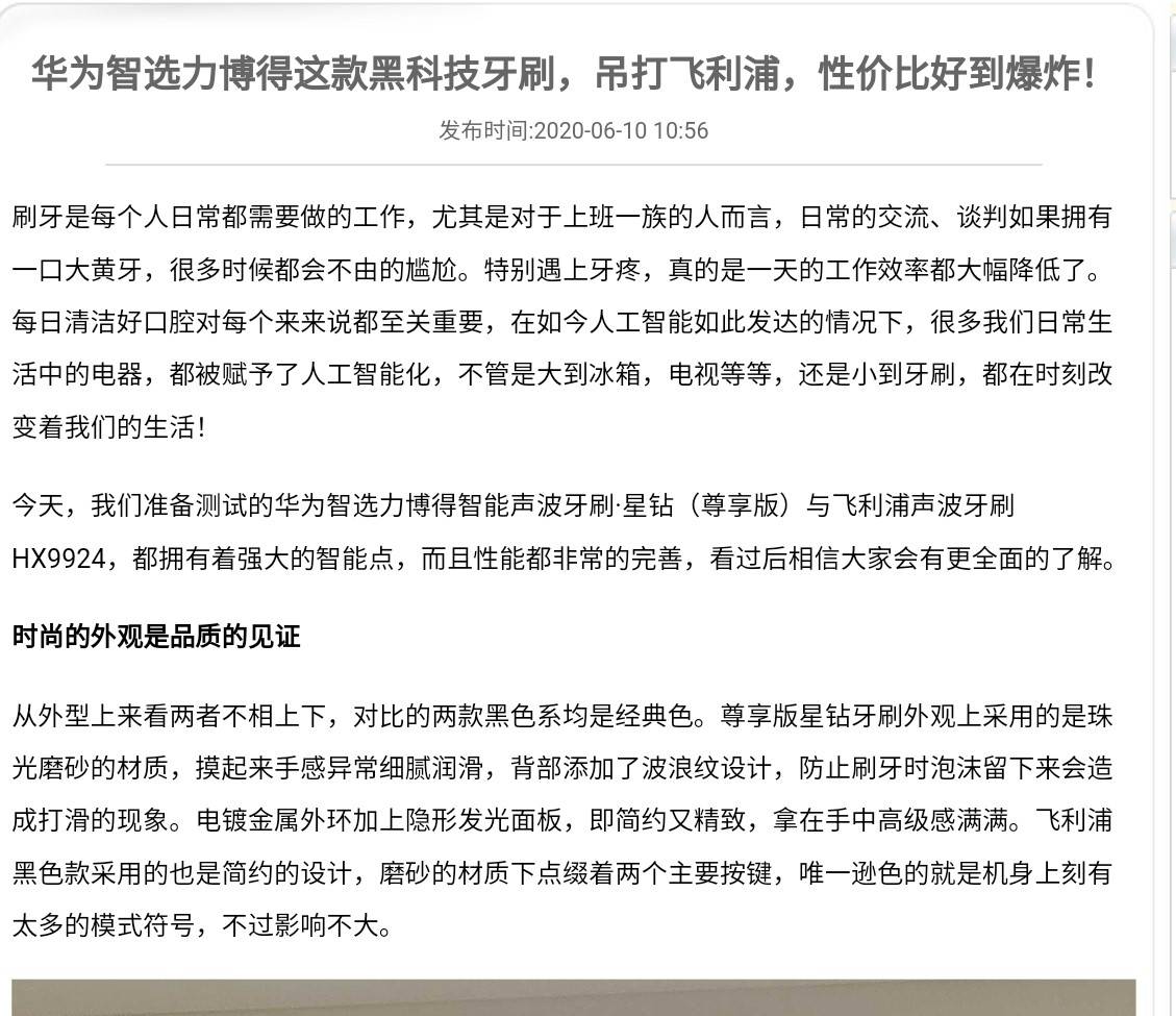 今年4月,力博得推出了首款“高端”智能声波牙刷星钻,公司董事长黄拔梓认为力博得智能声波牙刷·星钻是目前国内电动牙刷行业最牛逼的产品,完全可以与飞利浦一争高下。于是就安排企划部找人写公关稿,在产品宣传上给自己产品贴上“国产机皇”、“行业标杆”、“华为生态头部品牌”“硬核科技颠覆体验”、“洁牙超乎想象”等标签。同时出钱请一些没有底线的自媒体人撰写公关稿和评测。于是,华为智选力博得智能声波牙刷“碾压国际大牌”、“吊打飞利浦”、“完胜飞利浦”、“秒杀飞利浦”等文章满天飞,恶意攻击、贬低友商的同类产品,黑了飞利浦,再黑小米。