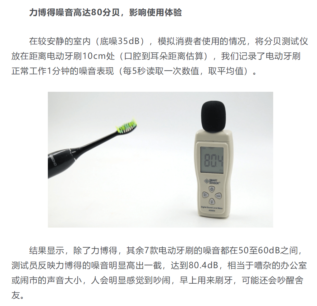 有媒体曾对力博得电动牙刷进行过测试,发现力博得电动牙刷刷头的磨毛率未达到国家标准,损害牙龈,而且噪音达80分贝,远远高于其他产品,牙刷清洁力较差,影响使用体验。