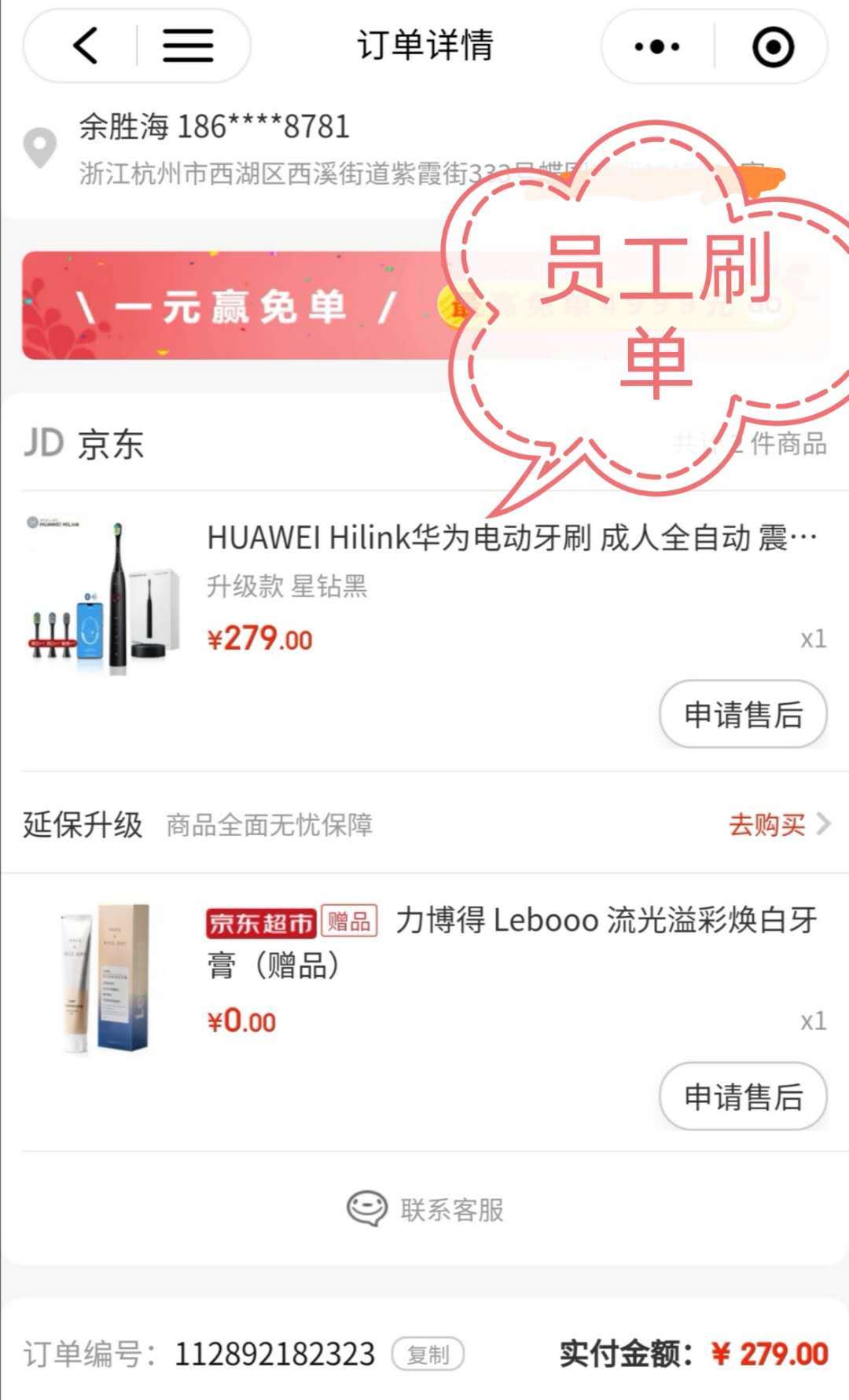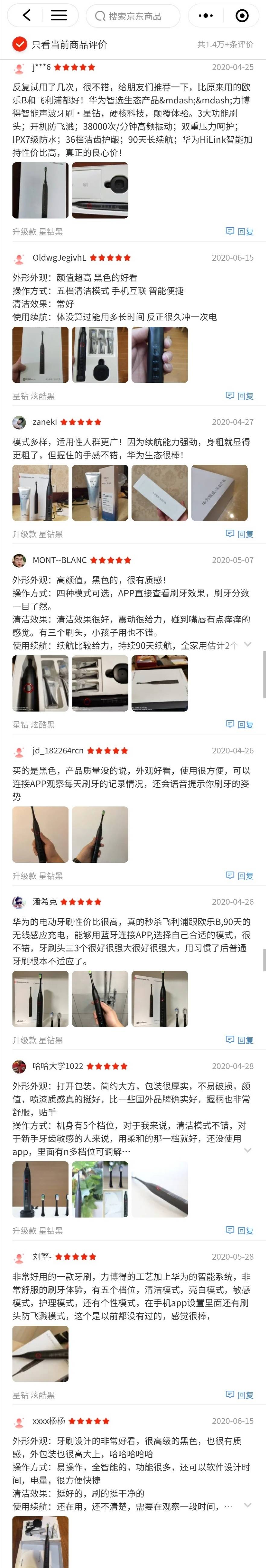 例如,2020年4月24日,力博得智能声波牙刷·星钻在华为京东旗舰店首发。上市当天,力博得公司组织员工在华为京东旗舰店购买刚上市的产品,费用由公司统一报销,并要求写五星好评,来诱导消费者下单。为了不让华为发现,公司要求员工不要填写公司地址。作为公司高管,我当时也购买了公司刚上市的星钻牙刷,并按照要求写了五星好评(见下图)。