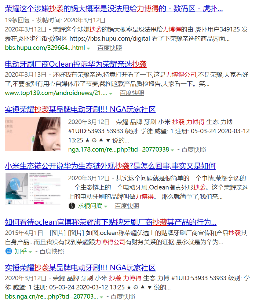 2019年10月,力博得公司与荣耀生态合作推出了一款荣耀亲选Lebooo(力博得)变频声波牙刷Pro,售价169元。2020年3月,小米生态企业公开诉荣耀亲选力博得变频声波牙刷Pro外形设计抄袭了2018年9月上市的欧可林(Oclean)Air,电商主图抄了2017年11月上市的Oclean SE,此事在网络上闹得沸沸扬扬。后来,公司营销总监陈一可向我汇报了此事,我就打电话找到小米雷总,才平息了此事,避免了一场官司。