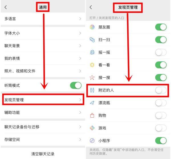 操作如下:打开微信【设置】——【通用】——【发现页管理】——【附近的人】,点击即可关闭。