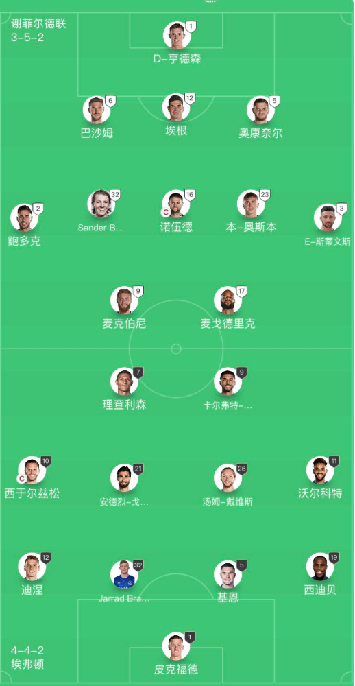 赛前双方首发出炉,同时埃弗顿官方也表示:前锋小基恩由于在训练中受伤,将无缘本场与谢菲联的比赛。