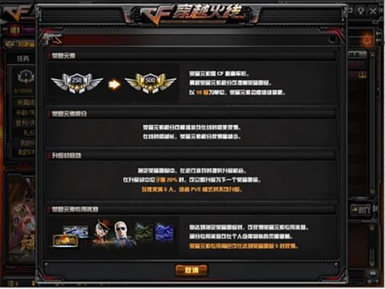 版本更新后,巅峰等级零碎——荣誉元帅等级正式开启,为CFer提供愈加丰厚的可玩内容。CFer达到已有的最初等级后便可开启荣誉元帅等级,荣誉元帅一共蕴含500个等级,均分为10个军衔,每一个军衔又蕴含5个头衔。玩家能够经过进行游戏猎取荣誉点数(非EP),来晋升荣誉元帅等级。跟着等级的晋升,CFer还能取得专属脚色、专属等级图标、专属加载布景等相应等级处分。
