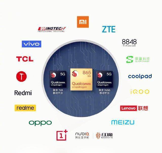 近年来,国内的手机商都相当依赖高通的骁龙处理器。在去年骁龙865新品发布会上,高通放出一张全家福照片(下图),其中高通5G芯片位居C位,几乎所有的国产手机商都围着高通转。