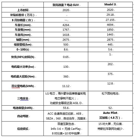 别克微蓝7电动SUV与特斯拉Model 3对比