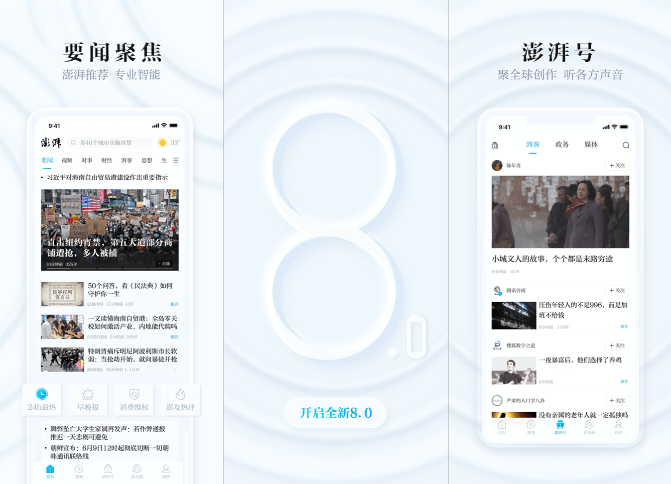 在此次线上发布会上,澎湃新闻总裁、总编辑刘永钢分别发布了基于澎湃算法的澎湃新闻APP8.0,以及版权素材一体化平台Pai视频和澎湃内容风控平台。