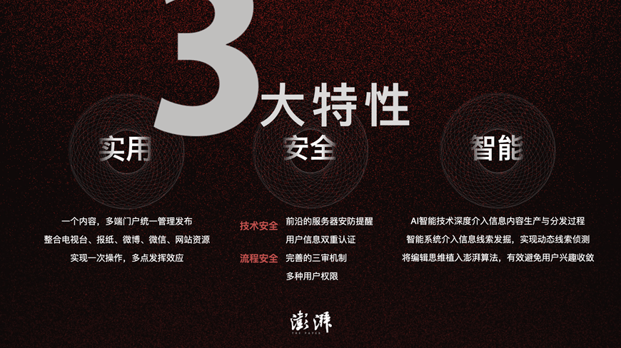 湃系统拥有安全、实用、智能的三大特性:提供技术安全和流程安全保障;整合与统一多端门户资源,实现一次操作,多点发挥效应;AI智能技术深度介入信息内容生产与分发过程,植入澎湃算法,有效避免用户兴趣收敛。