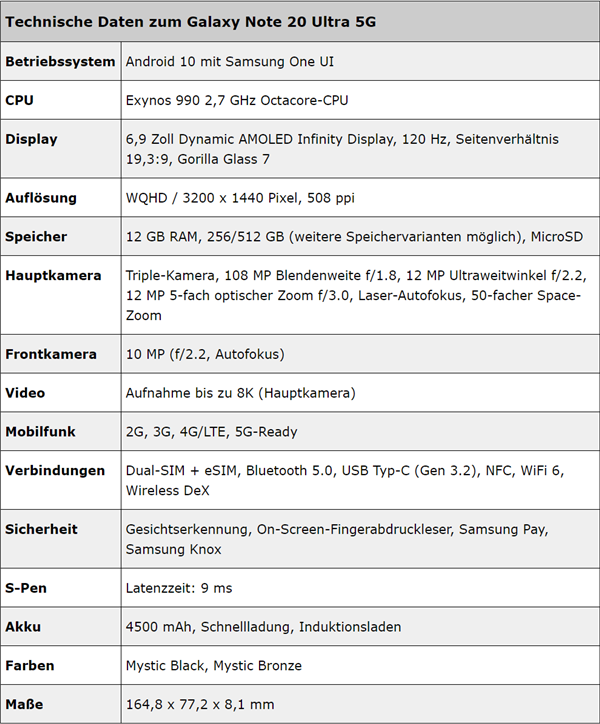 核心配置上,Galaxy Note 20 Ultra采用6.9英寸AMOLED柔性屏,分辨率为3200×1440,刷新率为120Hz,搭载Exynos 990处理器,配备12GB内存,提供256GB、512GB存储,电池容量为4500mAh。