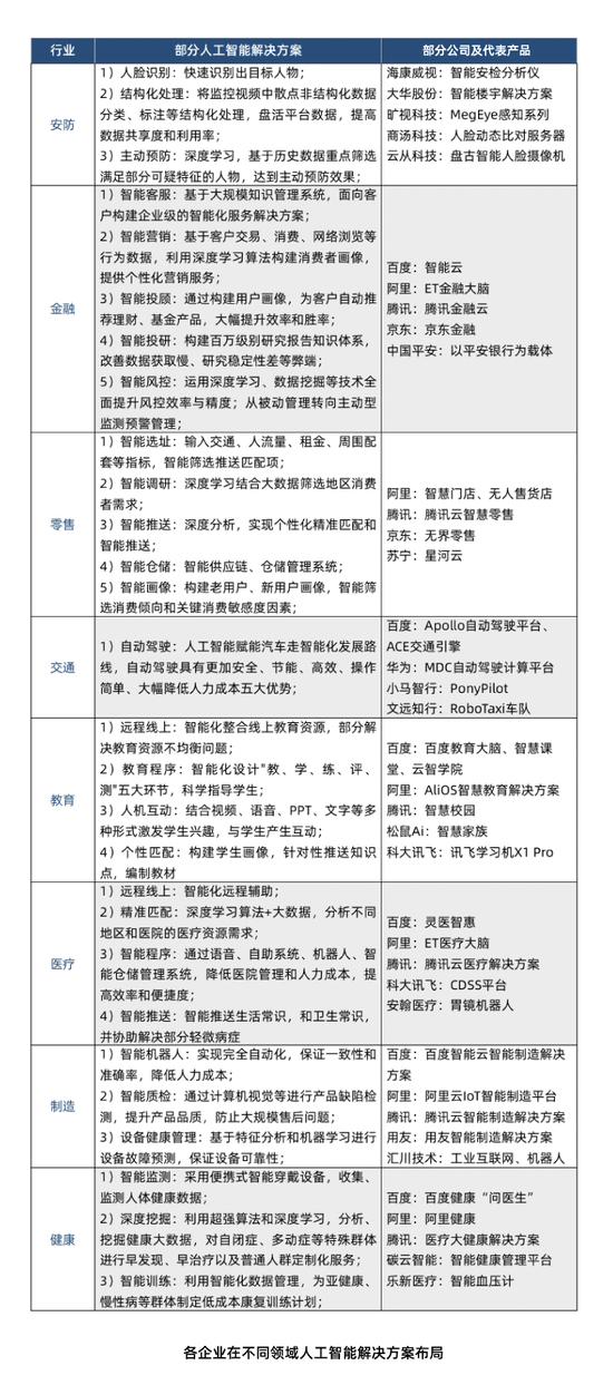 除了金融、交通以外,上述八年夜行业,人工智能处理计划及对应公司排列以下表所示。人工智能的深度剖析以及深度发掘性能是其赋能各行业使用智能化晋级的要害。