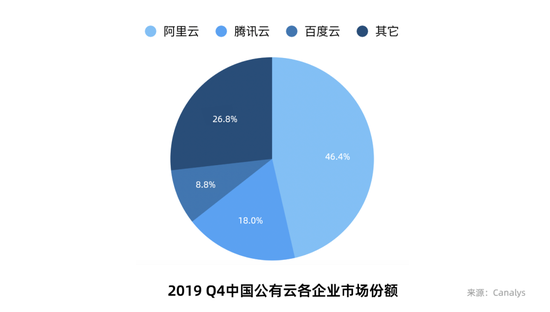 国际云较量争论市场次要被BAT瓜分,此中阿里份额占比近一半,盘踞抢先地位。英国调研机构Canalys公布了2019年第四序度中国公共云效劳市场陈诉,数据显示:阿里云排名第一,市场份额达到46.4%;其次是腾讯云市场份额18%,baidu云份额8.8%。