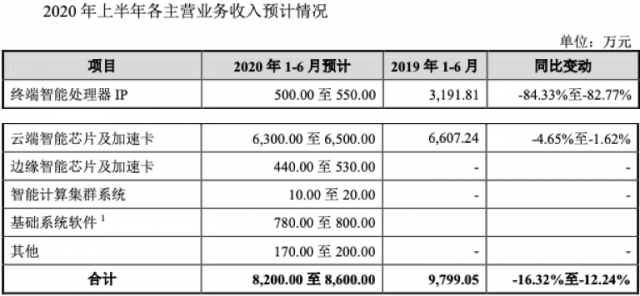 2020年上半年,寒武纪估计营收约为8200万元至8600万元,同比降落约12.24%至16.32%;净盈余估计为2.1亿元至2.3亿元。
