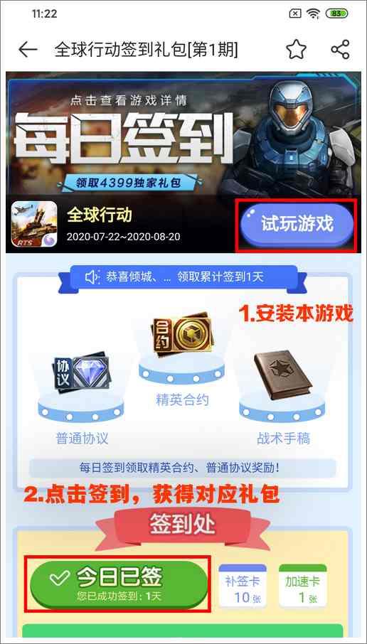 4、未安装用户下载并安装《全球行动》,即可参与签到;(已下载用户可直接更新后到活动页面参与签到)