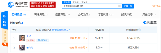 天眼查数据显示,该公司工商披露的股东中,王兴为第一年夜股东,持股比例为95%,第二年夜股东为美团联结开创人穆荣均,持股比例为5%。