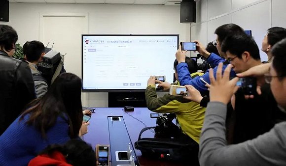 2019年3月22日,媒体记者正在上海证券买卖所科创板股票刊行上市审核中心会议室内寓目上市审核零碎操作流程演示。