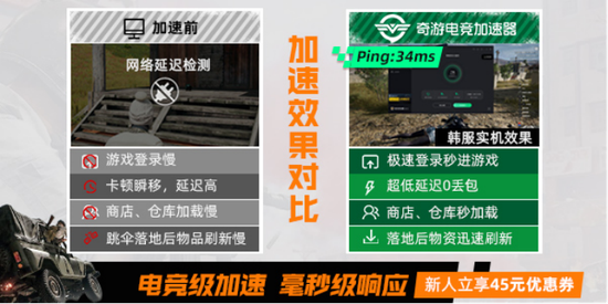 奇游电竞加速器是笔者多年在用的专业FPS游戏加速器,对于吃鸡类游戏特别是《绝地求生》有最好的线路支撑,以此优化联机网络达到最佳加速效果。此次第八赛季更新,笔者建议各位试用奇游,它极速适配了新版本优化需求,全新升级线路保障了超低延迟体验,有效解决更新失败/登录不上/掉线/卡顿/地图资源加载速度慢问题,支持免费试用,新用户送45元优惠券: