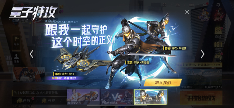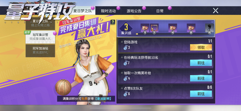 《量子特攻》夏日梦之队,为遨游者们带来全新的篮球决胜较量!参加此中,你将从街区赛开端,一途经关斩将挺进总决赛,并终极捧起冠军奖杯!想要参赛的遨游者,需求先到“冠军集训营”里实现登岸游戏、入场竞技、抽取补给、点赞队友等集训义务,能力支付“冠军约请函”、领有应战夏日梦之队的资历!别的“冠军加油站”里一样有约请函、各种非凡发型等处分等着遨游者们,让喜爱篮球的你猛纵情应战、独占鳌头!