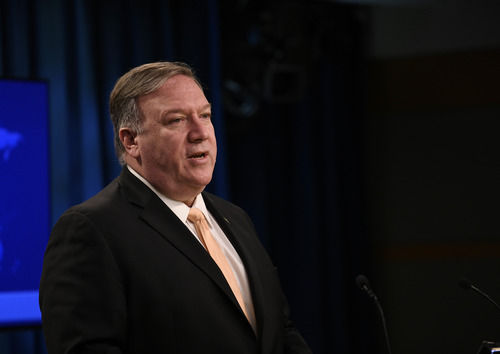 4月22日,在美国华盛顿,美国国务卿蓬佩奥在记者会上讲话。新华社记者刘杰摄