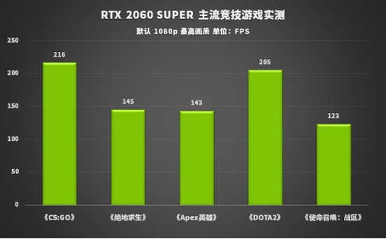 如上所示,在诸如《CS:GO》、《绝地求生》、《使命召唤:战区》等主流竞技游戏中,使用GeForce RTX 2060 SUPER显卡在1080p画质下,均能达到100以上的帧数,甚至个别游戏中能超过144 FPS,这样的性能足以满足高刷新的要求,也为玩家提供更快的游戏体验,追求更高的竞技水平。