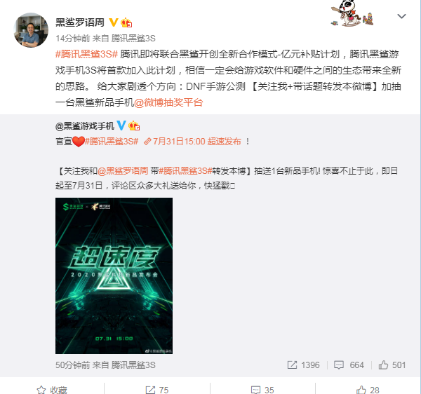 7月27日音讯,黑鲨游戏手机民间微博正式收回新品公布会官宣海报,全新的黑鲨3S将于7月31日正式公布。作为游戏手机行业的风向标,以“超速率”为主题的公布会约请函一经发布,立刻成为业界抢手话题,作为今朝多数几个业余研发游戏手机的品牌,黑鲨科技正在游戏手机体验方面的前瞻性以及引领性无须置疑,其黑鲨科技CEO罗语周正在专访中走漏,腾讯黑鲨游戏手机3S将采纳一块120Hz的三星AMOLED屏幕,让游戏手机进入“超速率”的新时代。