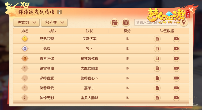 《梦境西游三维版》第二届群雄逐鹿跨服精英赛的积分赛阶段于上周末完结,160支战队通过强烈抗衡,32强战队终于降生!精锐组前三辨别是我腾飞咯战队、咏春之巅战队、知名之辈战队;勇武组前三则是无双战队、兄弟同盟战队、踏雪寻仙战队。积分赛后半程涌现出许多精彩对决,强队黑马频出,接上去咱们就来一同回顾一下。