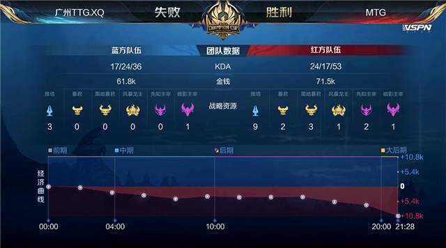 开局MTG入侵野区抢到红Buff。2分14秒MTG拿到暴君。2分48秒MTG入侵红Buff野区击杀苏烈拿到一血。3分MTG露娜野区单杀马超。3分51秒MTG中路开团1换2。4分MTG拿到先知主宰。4分25秒广州TTG.XQ中路击杀周瑜。5分07秒广州TTG.XQ中路开团,MTG反打1换2。6分13秒MTG推掉广州TTG.XQ对抗路一塔。6分36秒广州TTG.XQ对抗路击杀周瑜。7分23秒MTG中路击杀苏烈。7分55秒广州TTG.XQ野区开团3换3。8分33秒广州TTG.XQ野区击杀露娜。9分58秒广州TTG.XQ中路开团2换2。10分22秒MTG拿到黑暗暴君。10分27秒广州TTG.XQ拿到主宰。12分14秒广州TTG.XQ中路击杀盾山。14分MTG中路开团,广州TTG.XQ反打3换4。15分李元芳河道一打二双杀。15分25秒MTG拿到黑暗暴君。16分24秒MTG拿到主宰。18分05秒MTG对抗路开团2换2顺势推掉广州TTG.XQ对抗路高地塔。19分30秒MTG中路开团0换2,李元芳超神。19分47秒MTG拿到黑暗暴君。20分23秒MTG拿到风暴龙王。21分07秒MTG野区开团0换3拿下胜利。