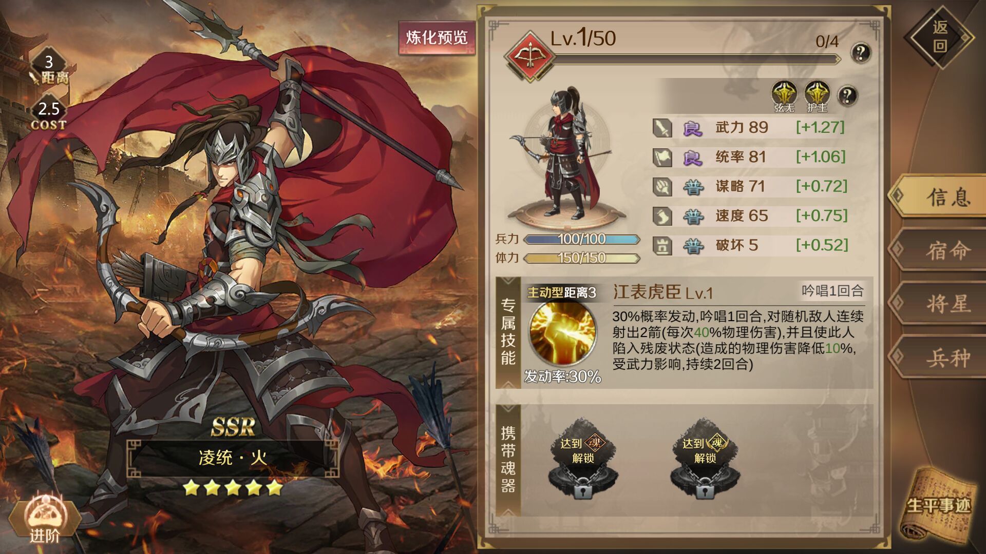 本篇内容只是引见一下凌统这个英魂的具体信息 ,而详细若何搭配阵容和若何搭配魂器,则需求列位君主到游戏中自行钻研了。