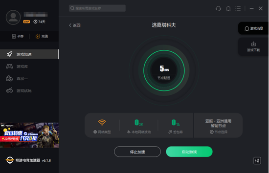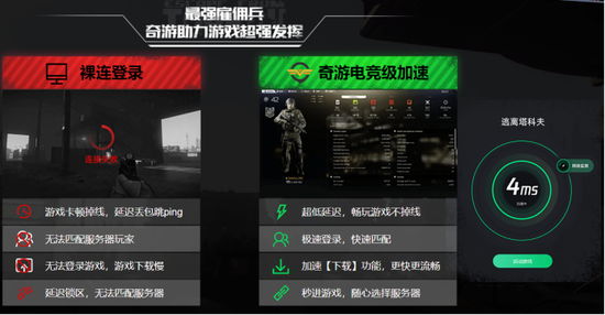奇游加速器支持《逃离塔科夫》官网注册加速、更新满速提速、游戏联机加速,延迟直降50ms起,是塔科夫等硬核FPS游戏的首选加速器:
