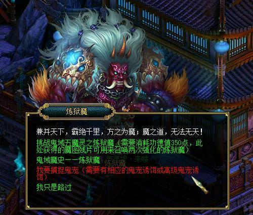 鬼门关中的五年夜守护神,辨别为炼狱魔、狱獒、魅灵、阴阳师以及血丹魂,玩家正在积攒到肯定数目的功德值之后,就能够正在组队或单人的状况下对其进行应战。70级至89级的玩家只能应战炼狱魔;90级至109级的玩家能够应战炼狱魔、狱獒;110级至129级的玩家能够应战炼狱魔、狱獒、魅灵;130级至149级的玩家添加应战阴阳师,150级以上的玩家添加血丹魂应战。