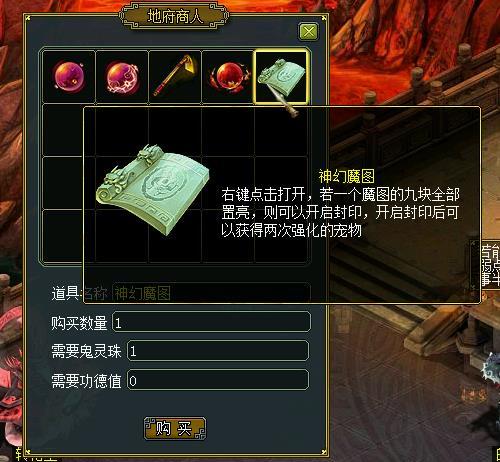 每一场应战成功之后,一切参加者均会取得一个相应的鬼宠残片。集齐九种没有同的鬼宠残片后,还需求返回鬼门关贩子处用一颗鬼灵珠兑换一个神幻魔图。魔幻神图道具能够将某个鬼宠的九个没有同残片组合起来,成为带有“一般”后缀以及“鬼门关”标签的宠物。另外,取得的“鬼门关”标签的宠物有肯定概率带有生成技艺。