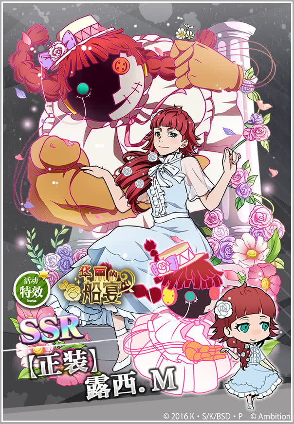 第一张SSR就是可恶的东洋风打扮服装露西.M了,水蓝色的号衣以及红色玫瑰装点出优雅的贵族气味,身侧的微小玩偶安妮更是给这幅画面削减了几分童话的浪漫。尽管她还没有是很顺应这身衣服,但仍是享用着宴会的气氛。