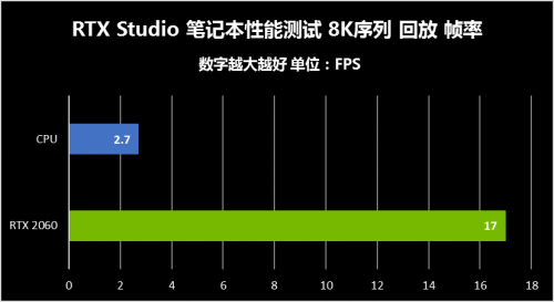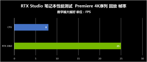 在面对更为主流4K序列剪辑上,RTX Studio笔记本则表现得更加从容。回放测试中,利用RTX GPU回放帧率是CPU的3倍多。