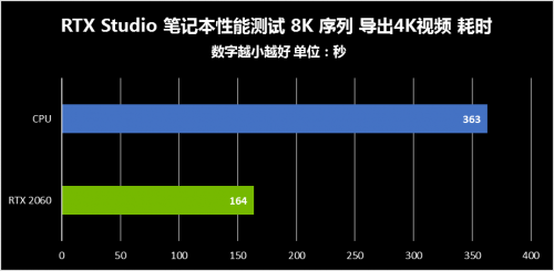 在具体测试中,可以看到 RTX studio笔记本在处理8K序列的优势,回放时帧率明显比CPU的更高。导出作品时,RTX studio笔记本的表现也令人惊喜,8K序列 导出4K分辨率视频 仅需不到3分钟,1080P更是只需要1分钟!