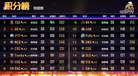 为期15天的常规赛正式落下帷幕,经过激烈战斗,最终恭喜TSG、AG、IFTY、MCG、COC、Tianba、EDG、RNG、NH、4AM、PeRo、SMG、CSG、DLG、OIG、QM、SJG、NEXT、1246、LYG、Wovles、XJ、Su4、KX这24支队伍成功晋级淘汰赛!