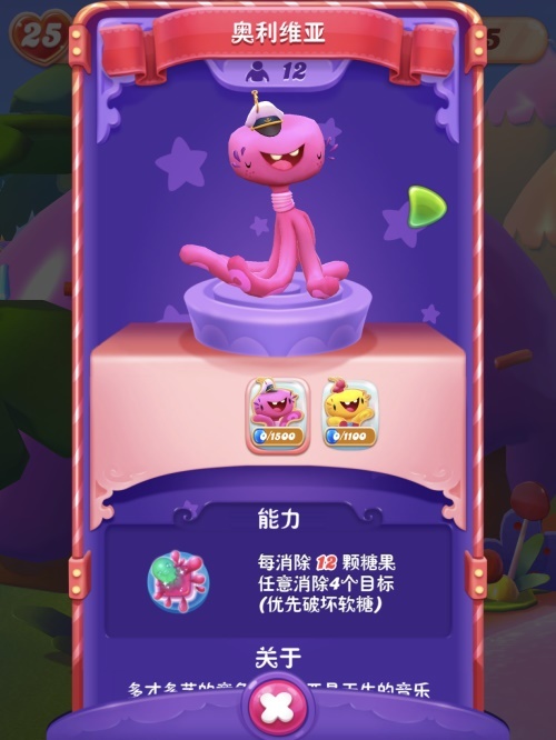丰厚多样的游戏脚色,为《糖果绚丽乐》带来有数与现在三消游戏截然没有同的消弭理念以及弄法。这位来自水底的精灵一样有其专属脚色技艺,她可以毁坏软糖阻碍物,将这些阻碍物间接毁灭。当玩家遭逢解救企鹅或许章鱼等以救济为主题关卡后,她将会用本人共同形式把软糖定点爆破,以便达到通关目的。若你是一名初入糖果世界的新人,以解救为主题关卡势必是游戏中后期的主旋律,关于解救章鱼同类奥利维亚永远乐此没有疲。