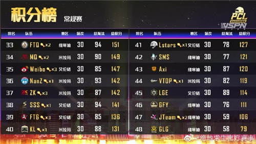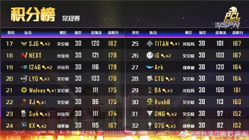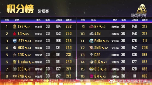 通过15天的高强度对战,惯例赛已落下帷幕,24支抢先步队进入下半赛程。春季赛赛制晋级,参赛名额精简,起落级轨制也有所调整,这让本次2020PCL冬季赛后果变患上尤其首要。此中,惯例赛体现最为亮眼的莫过于TSG战队了,他们正在惯例赛上拿到四场较量的成功,以总分262的分数高居第一名。排正在第二位的则是老牌俱乐部AG战队,队员正在经验长期的磨合后状态炽热,成为惯例赛上吃到最多鸡的步队之一。夺冠年夜抢手iFTY战队则以最高裁汰数166个总分245分位列第三位,正朝着高峰稳步迈进。