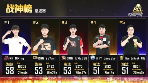 正在拿到2020PCL秋季赛MVP之后,NH_Mming一鸣惊人,跻身到了顶级战神的行列。此次冬季赛是NH_Mming第一次参与线下赛,但老成持重的他其实不怯场,越打越勇,终极以58个裁汰数,场均损伤344位列战神榜第一名。RNG_ZpYan1以及SMG_17Mad98以53个裁汰数屈居第2、三位;第四名以及第五名属于iFTY_LongSkr以及Tian_LuRenA_XHZ。心愿这些选手能不卑不亢,将火爆状态放弃到后续较量,给观众带来愈加精彩的体现!