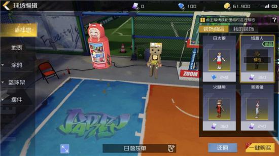 比较有意思的是,球场还加入了DIY元素,和一般的换球场皮肤不同,这里我们可以个人按喜好来选择地面涂鸦,球框,周边的配件,添加一些个人创作色彩。