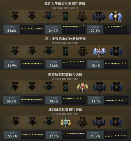 其中以56.54%胜率高居榜首的幽鬼无疑是版本新贵。在DOTA2游戏内的PLUS助手统计中,幽鬼的上场率与被禁率也是逐日呈上升曲线,幽鬼在超凡入圣对局中便拥有54.6%的胜率,而随着段位降低,幽鬼的胜率却不降反升,在先锋局中幽鬼的胜率能够达到骇人的60.3%,而在传奇局中幽鬼的胜率也能够保持在55.7%,同样是一个非常高的水平。如果你还在疑惑自己为什么难以赢下比赛,不妨试试版本最强核心:幽鬼。
