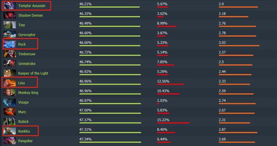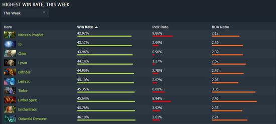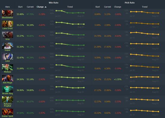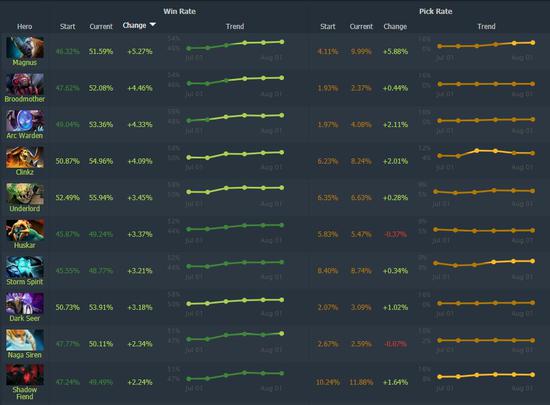 根据DOTABUFF所提供数据,我们可以看到一个月内各个英雄胜率变化明显。其中胜率增长最显著的十位英雄分别为: