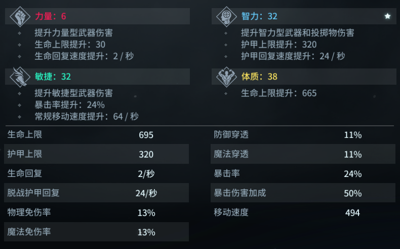 九月的属性总体较为平衡,虽然较低的力气属性使患上这位西方女侠客正在生命下限以及回复上处于优势,但体现较好的矫捷以及智力带来的挪动速率加成以及较高的护甲下限能够让她疾速脱离战场,并正在短期内规复状态重归战场。