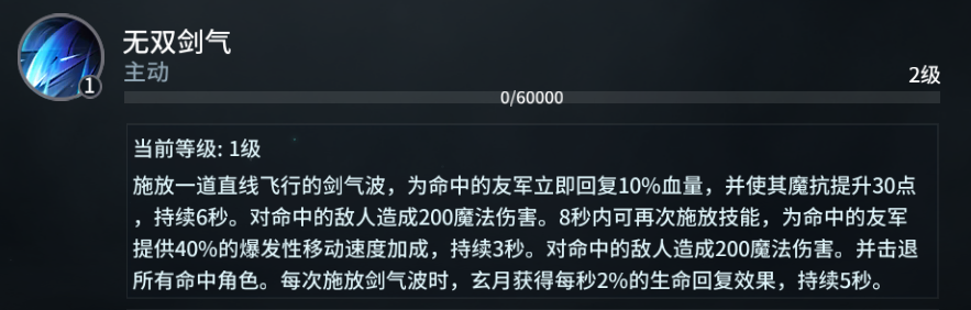 自动技艺【无双剑气】:施放一道直线航行的剑气波,且可进行两段施放,对友军以及敌军孕育发生没有同的成果。