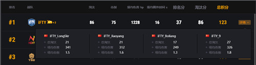 从惯例赛开端,iFTY四名选手就遭到了宽泛存眷,刚刚拿下PCS1东亚洲际赛冠军的他们,势头正旺!合营也是愈来愈默契,进入裁汰赛以来,他们便一发不成拾掇,稳稳抢先其他步队,终极以86个总裁汰,总分123拿到惯例赛第一位,俯首升级决赛!86个裁汰数也比第二名足足多了21个,因而可知自摸炽热,四集体的数据也长短常均匀,能够说是拧成为了一股绳,处处是劲!