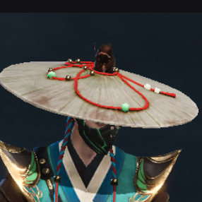 红线串碧玉装点本来枯燥无华的头笠,双侧垂下的头笠绑带青红交叠,让整个打扮服装正在低调中略显声张。
