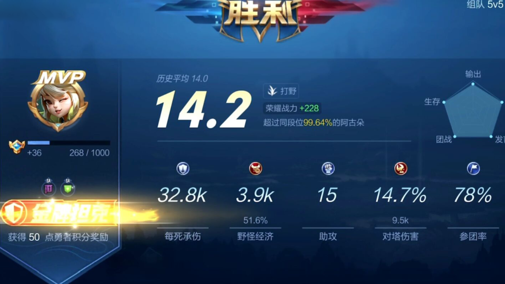 最后一局耀神也是轻松的拿下胜利,打的输出虽然不是很高但是依旧打出了很高的评分,阿古朵这个英雄作为一个打野英雄还是很好带节奏的,所以拿MVP还是很简单的,最后耀神这一局也是打出了十四点二分的高分。
