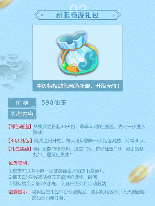 2.新服畅游礼包:尊享专属vip绿色通道,30天持续好礼,总共可获得1500万师门贡献、750个通宝和300枚多彩仙玉,血法药瓶更是多到用不完!