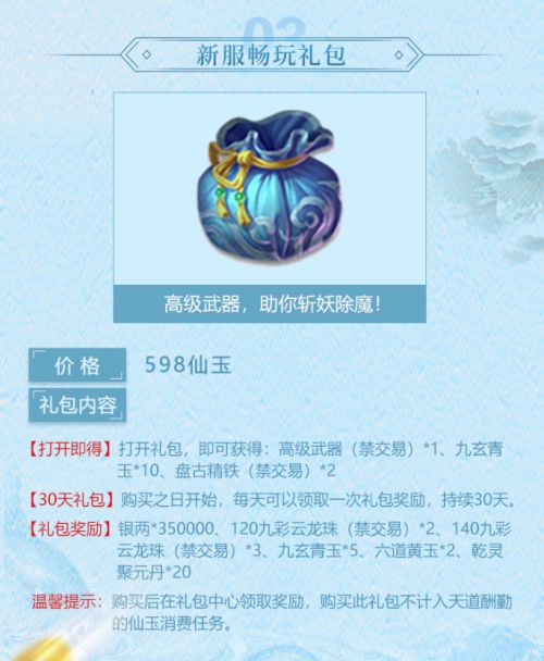 3.新服畅玩礼包:包含高级武器一把和升级材料,前期斩妖除魔必备利器!同时每天还可在礼包中心领取一次奖励,持续30天!