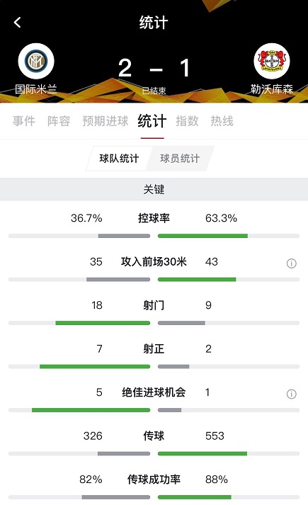 数据方面,勒沃库森全场控球率63%高于对手,射门方面国米18次射正7次创造5次绝佳进球机会;勒沃库森方面射门9次射正2次创造1次绝佳进球机会。