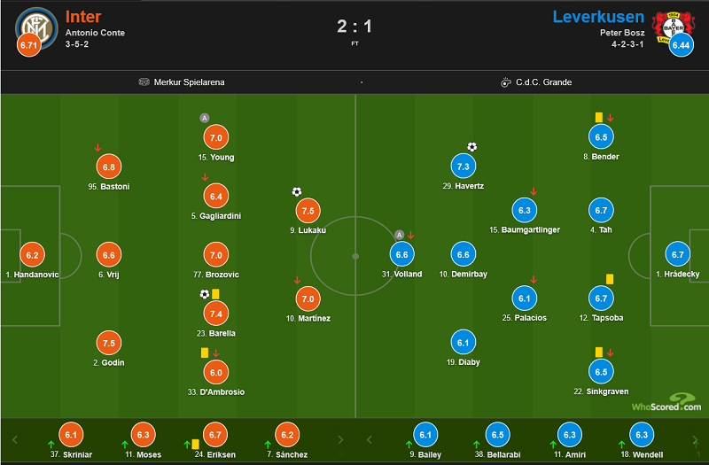 评分方面,打进一球的卢卡库与戈丁获得全场最高评分,巴雷拉紧随其后;勒沃库森方面哈弗茨获得全队最高评分。
